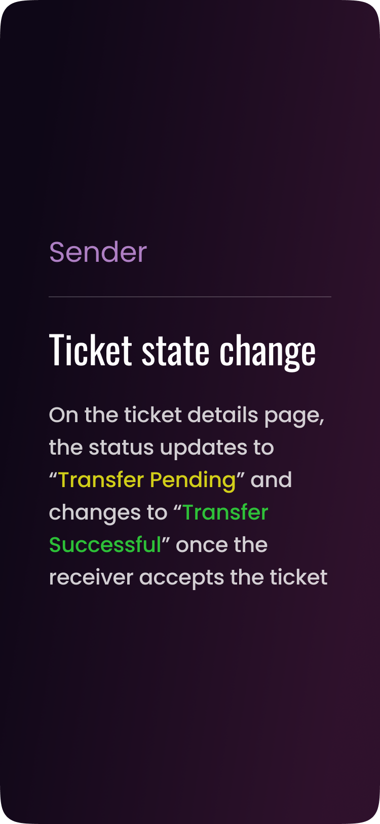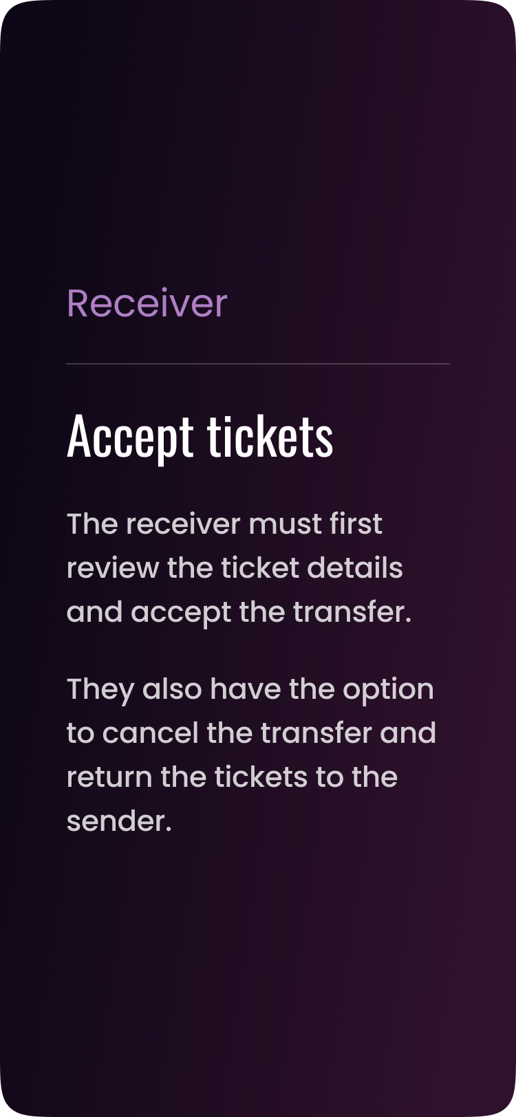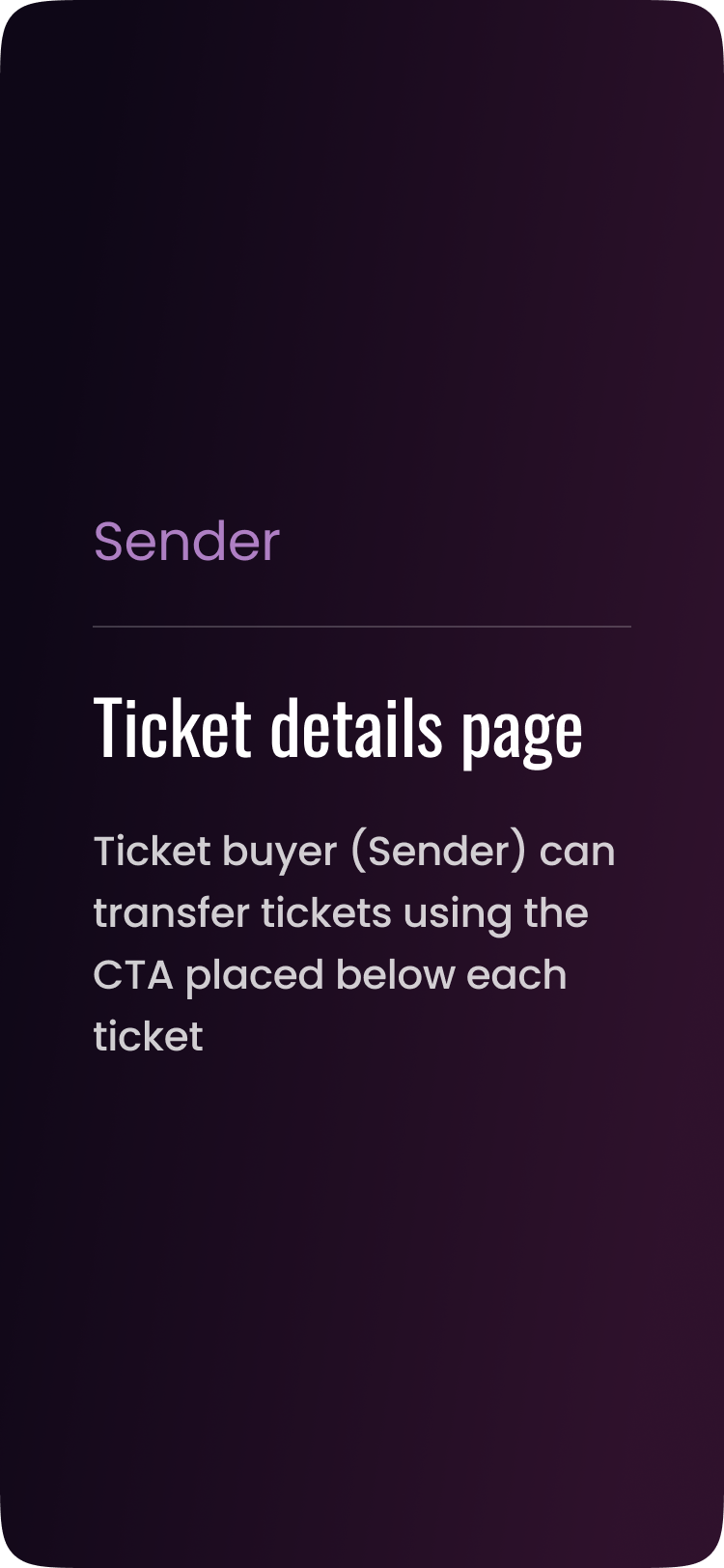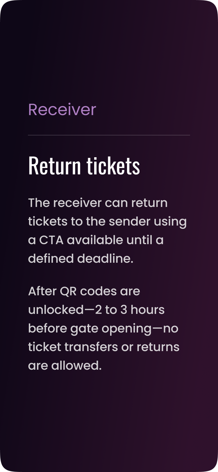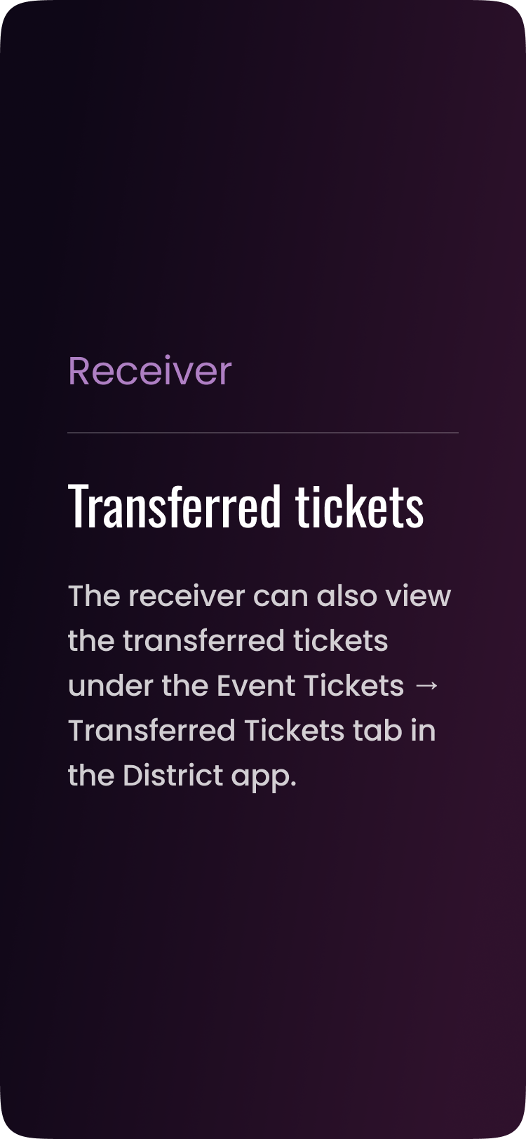 District allows users to seamlessly transfer event tickets to friends and family — whether plans change or attendees enter the venue separately. The challenge was to design a flow that feels instant and effortless, while still being secure, and transparent.