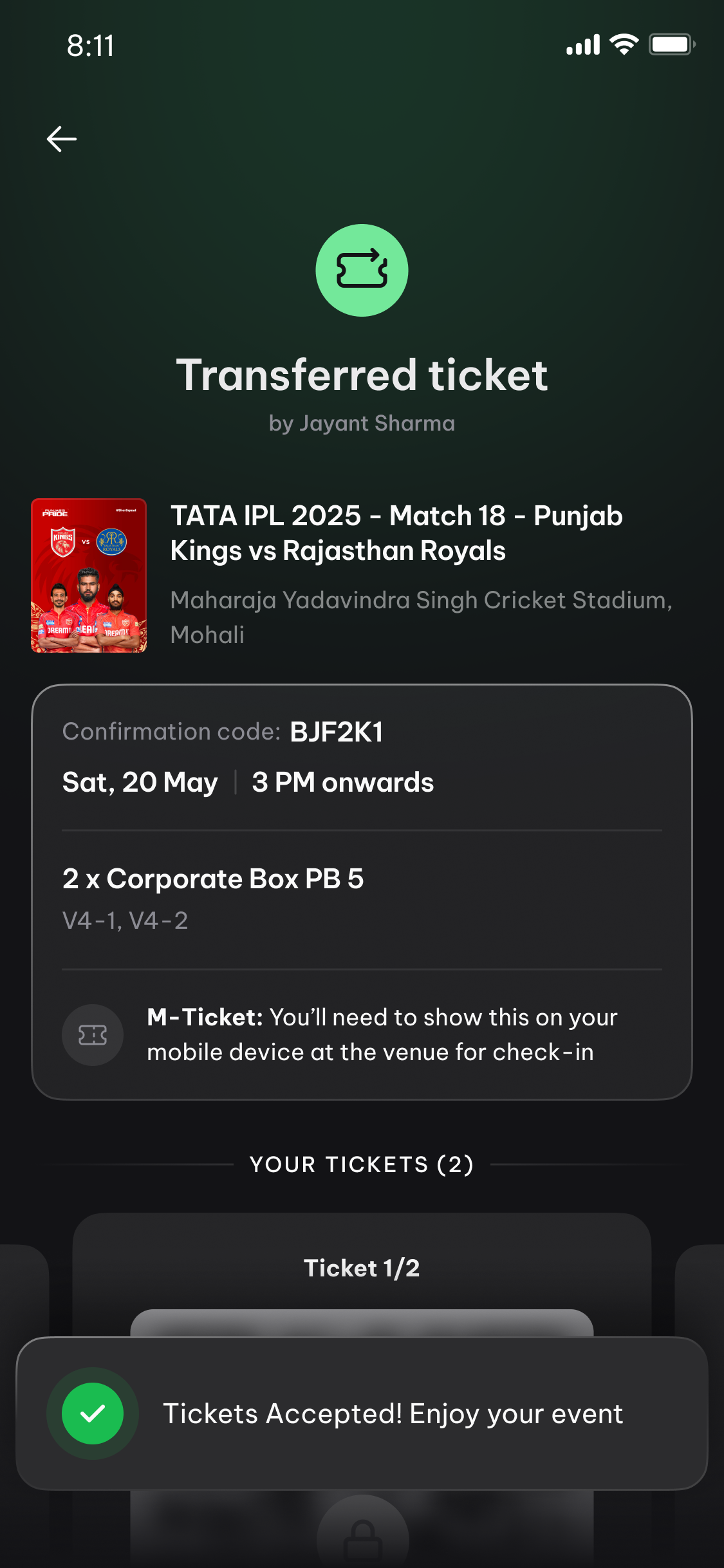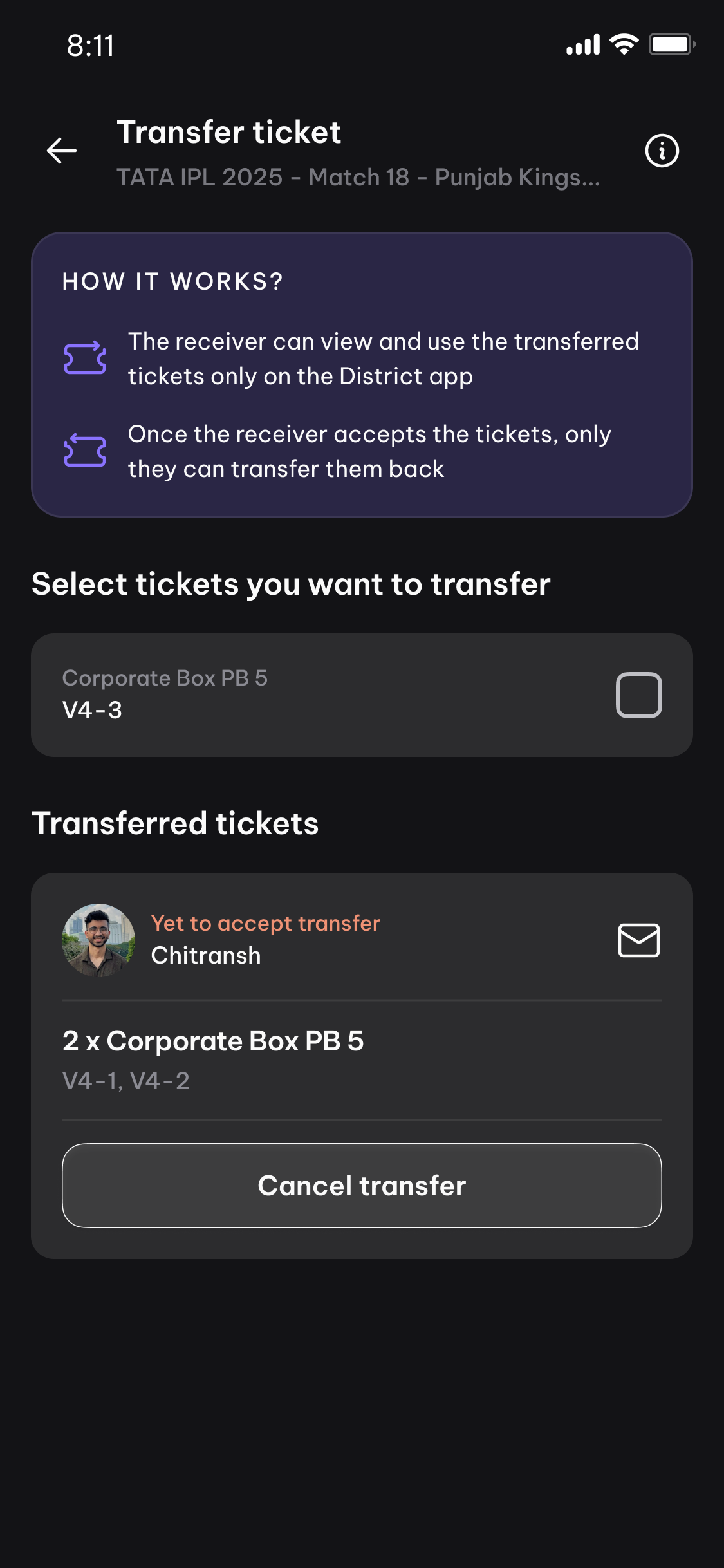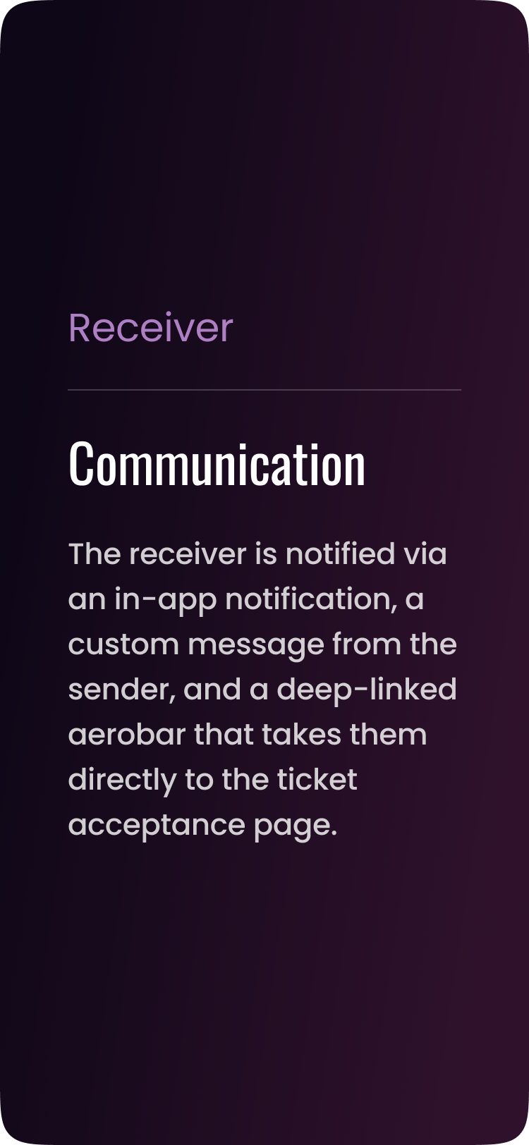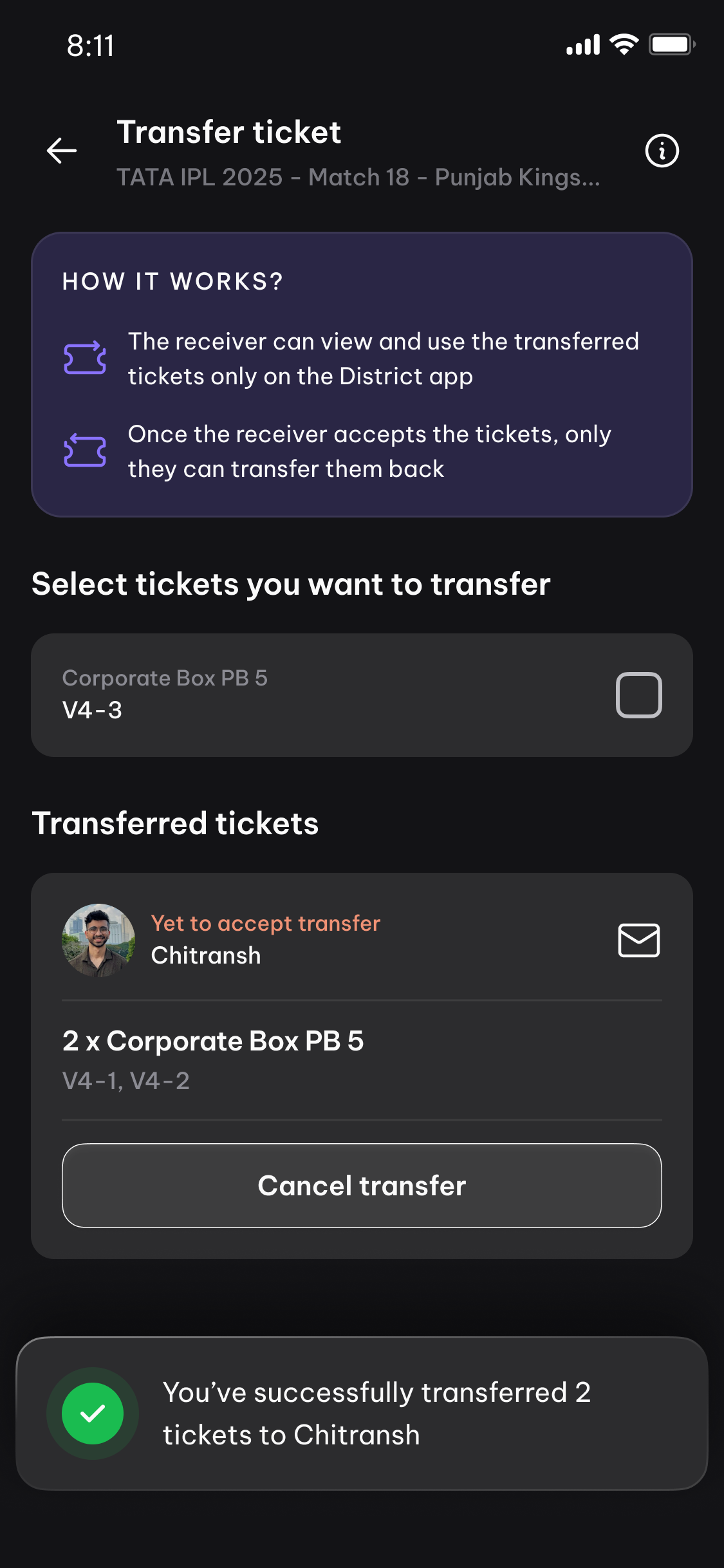 District allows users to seamlessly transfer event tickets to friends and family — whether plans change or attendees enter the venue separately. The challenge was to design a flow that feels instant and effortless, while still being secure, and transparent.