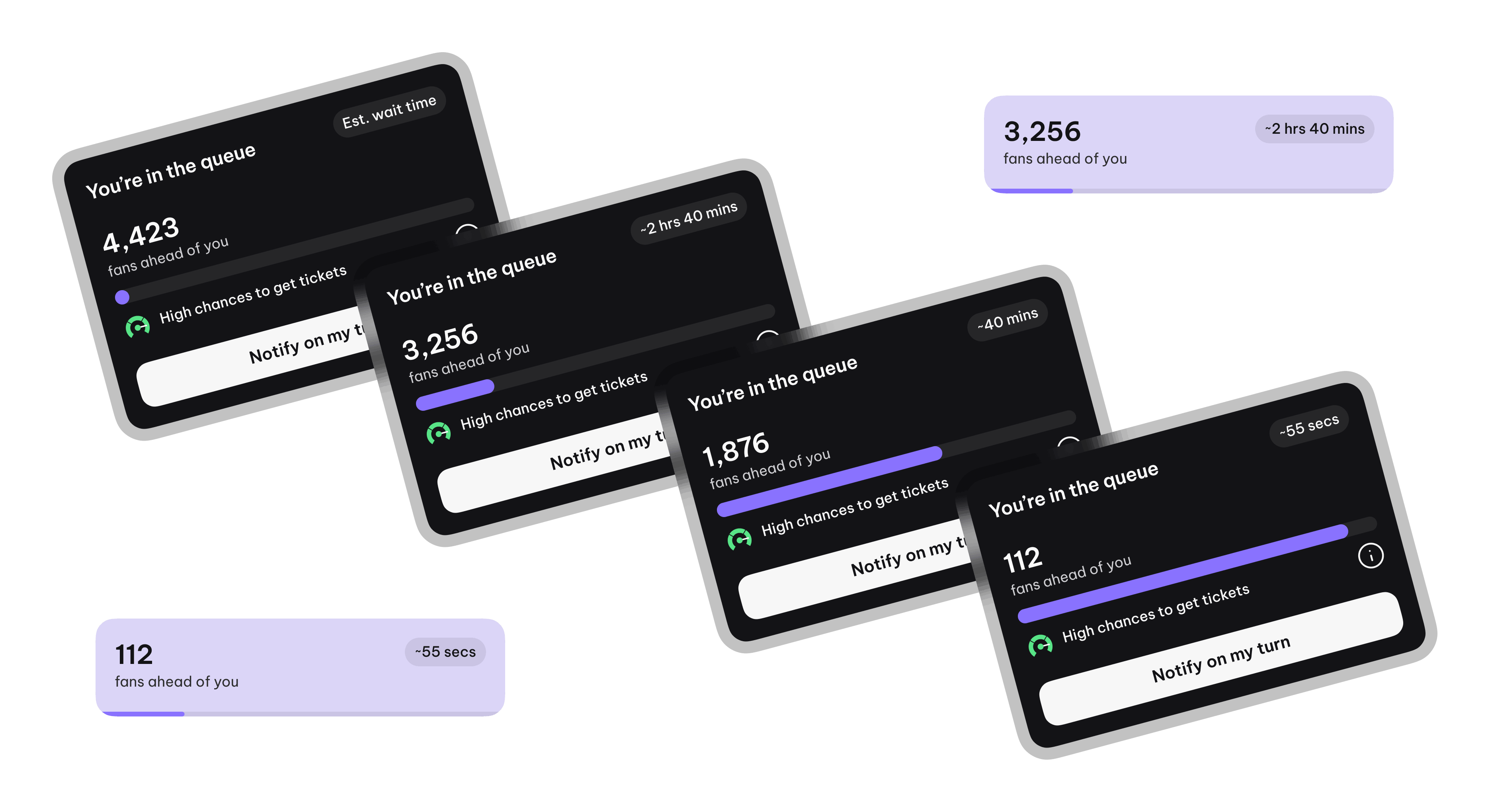 A clean, large, readable card showing: Your queue number, People ahead, Approx wait time and Dynamic progress bar.